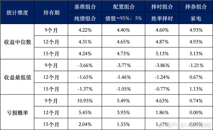 在产品设计维度上,拉长“固收+”产品的投资期限有助于降低亏损风险。在“固收+”理财产品设计的过程中,产品期限是非常重要的一环。理财投资者更偏好中短期限的产品,全市场1年期以上理财产品规模占比不足15%,降低“固收+”产品的投资期限容易获得资金关注。但是拉长“固收+”产品的持有期限,可以提高收益并降低亏损风险。表4统计了不同投资期限下不同策略组合的收益数据,从不同组合的收益中位数来看,当组合的投资期限从9个月拉长到15个月,配置组合、择时组合、择券组合的收益中位数都有提高,即拉长投资期限有助于提高组合收益;从组合的最差收益来看,投资期限从9个月拉长到15个月,四类组合的最低收益率均有收敛;从不同组合的亏损概率来看,纯债组合、配置组合、择时组合和择券组合的亏损概率随着投资期限的拉长而降低,即拉长投资期限有助于降低亏损风险。所以,发行“固收+”产品需要考虑产品期限的问题,以实现产品“少亏多赚、回撤低”的目标。