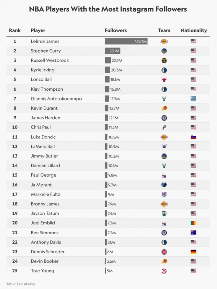 NBA球员ins粉丝数排行榜,詹姆斯以1.59亿断档领衔,库里威少分列二三位。