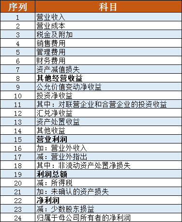 首先,我们看一下利润表的一般结构:从营业收入到归母净利润中间,有些科目并非每个企业都会有,但是从1到6确是所有企业都会存在的。
