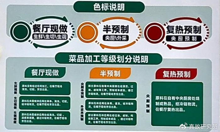 另一个是老乡鸡。在它的前台,用绿色、橘色、红色分别标注了“餐厅现做”(生鲜/生切/生调)、“半预制”(央厨/外采)、“复热预制”(央厨预制)三个分类。