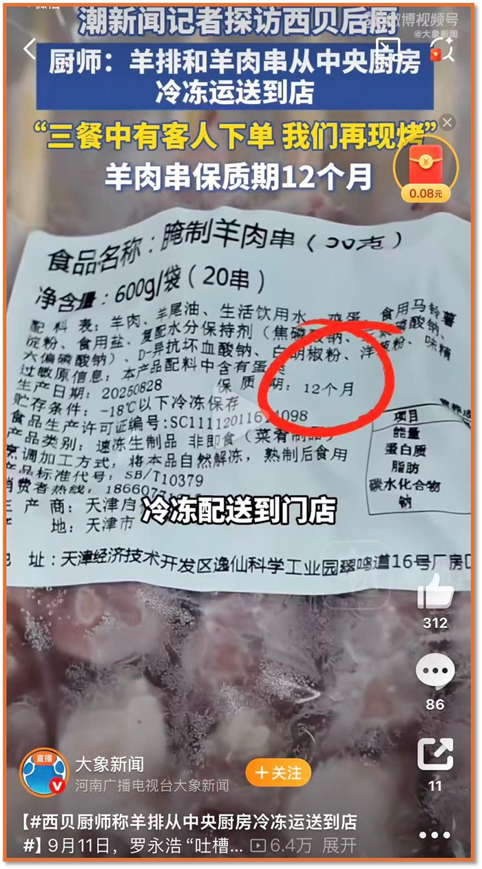 还有厨师长特别实诚地为自己老板“开辟新话题”:西贝部分菜品存在隔夜情况。比如煮好的羊排(保质期24个月)赏味期是三餐,“今天上午一餐、下午一餐、明天上午一餐,但不会影响品质,和现煮的出来的味道几乎一致。”