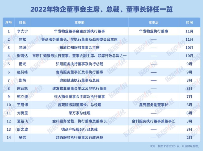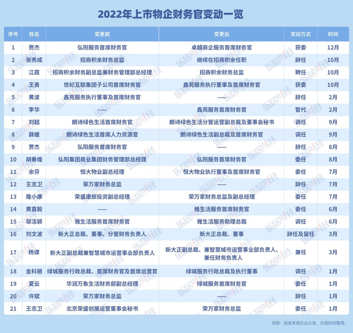 而据乐居财经《物业K线》统计,2022年里,包括卓越商企服务、弘阳服务、荣万家在内,9家上市物企的财务官换防,涉及20个人的进退。