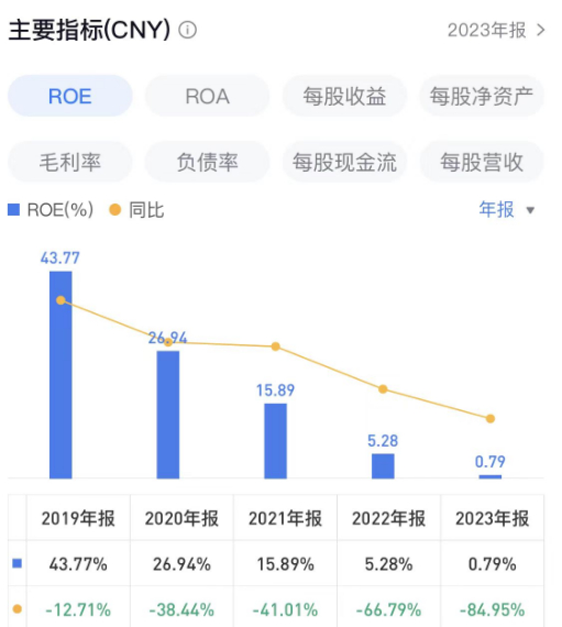 从ROE来看,2020年-2023年,其ROE分别为26.94%、15.89%、5.28%、0.79%。