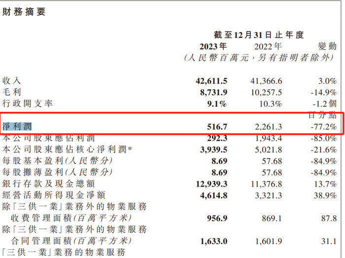 2023年,碧桂园服务实现收入426.12亿元,同比增长3%;股东应占利润约2.92亿元,同比下降约85.0%;净利润5.17亿元,同比下降77%。