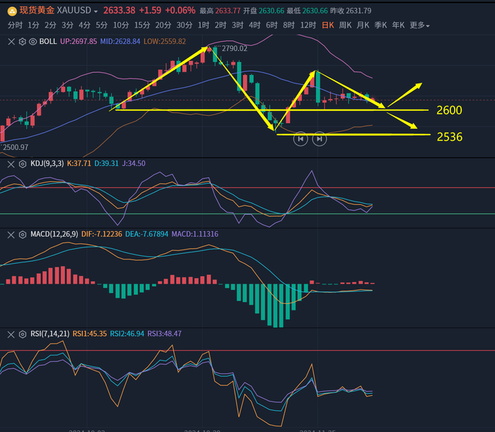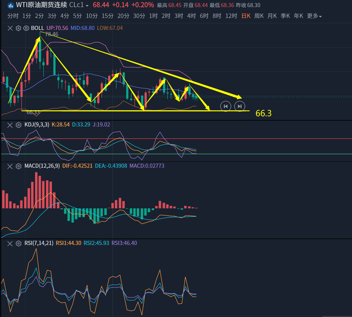上周一由于以色列和黎巴嫩将要停火的传闻缓解了市场对原油供应中断的担忧,油价大跌近3%,随后持续新低走势偏弱,周二受避险情绪升温的影响油价反弹近3%,但是周三周四均下跌收阴,整体走势偏弱,下方预计将向67下方寻求支撑。四小时线来看,周三反弹至70.51美元/桶后开始走弱,美盘后一度大跌至最低68.49美元/桶,周四反弹至69关口上方后再度回落下来,目前油价运行在布林带中上轨之间,KDJ死叉后向下运行,MACD死叉后向下运行,短线走势偏空。