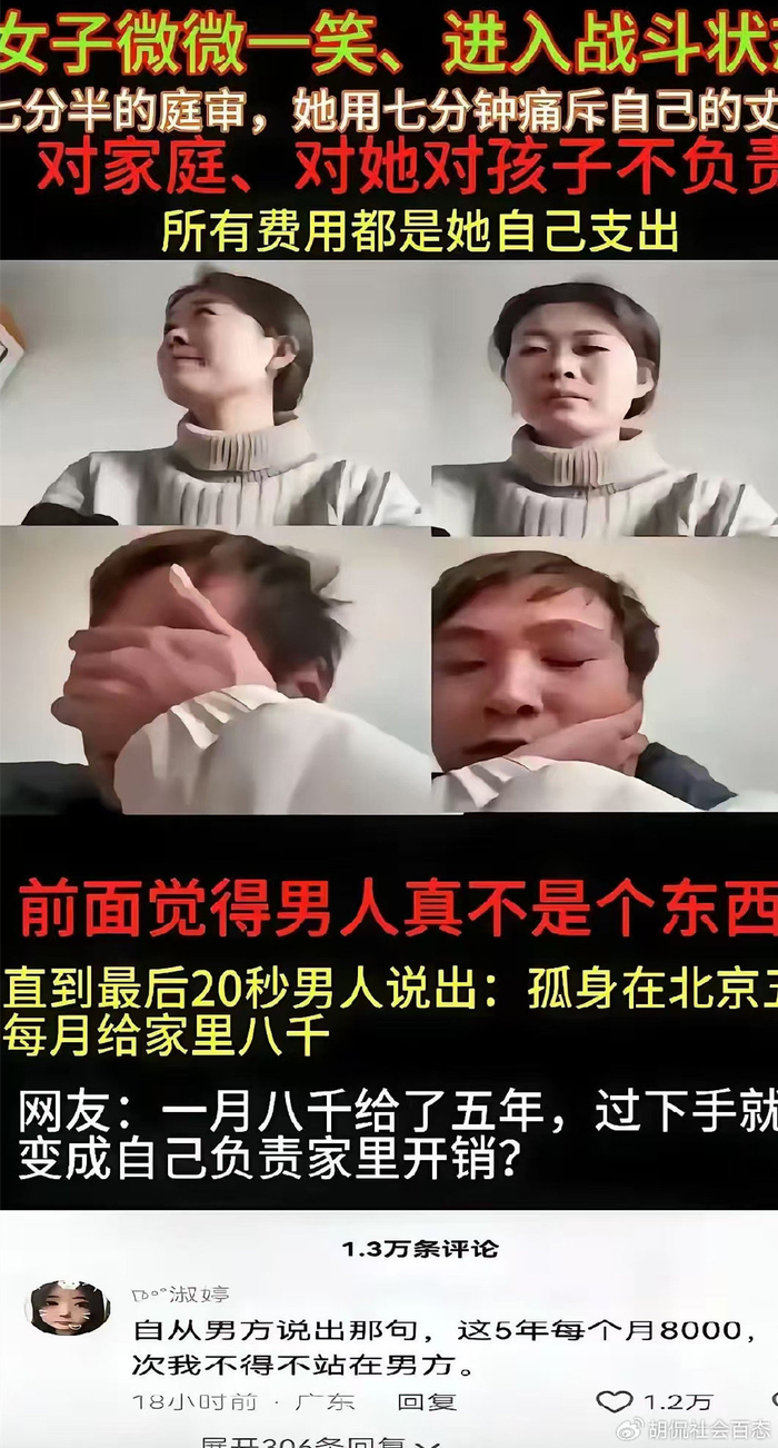 法庭上,女方能说会道,说个不停,男方老实巴交,光知道抹眼泪,想插句话还立马被打断。要不是最后男方那句“我每个月给你转8000”,大家没准就信了女方的话,真觉得男方不是东西。