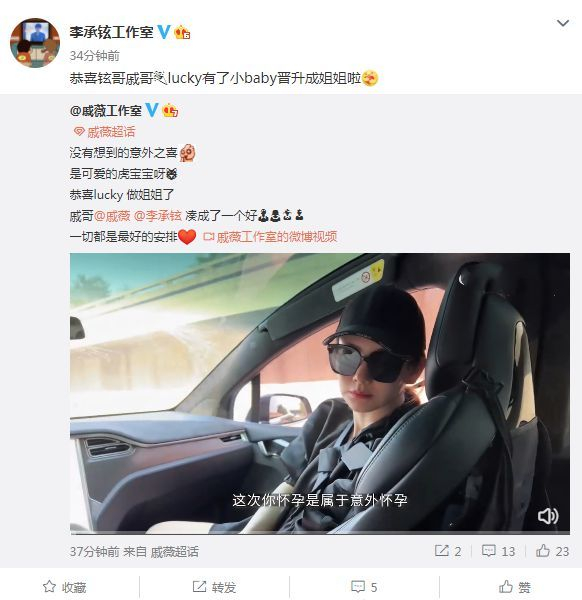 晚些时候,戚薇工作室分享了一段戚薇从怀孕到生产的vlog,并写道:“没有想到的意外之喜,是可爱的虎宝宝呀,恭喜lucky做姐姐了,戚哥、铉哥凑成了一个好,一切都是最好的安排”。随后,李承铉工作室转发动态,并发文:“恭喜铉哥戚哥lucky有了小baby晋升成姐姐啦”。虽然戚薇和李承铉本人的社交账号暂时还没有官宣二胎得子的好消息,但工作室的发文无疑代表了他们,真是恭喜恭喜了。