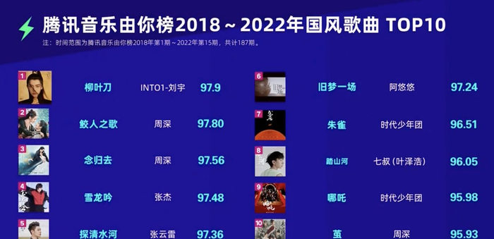 同样上榜国风歌曲历史最高的还有周深,可谓“流水的榜单,铁打的周深”,凭借两首歌曲《念归去》《鲛人之歌》分别获得了97.56和97.8的成绩,在2022年第3期-第14期连续保持国风榜单TOP1。他的新歌《I See Us》还登上腾讯音乐由你榜2022年第20期的TOP2。