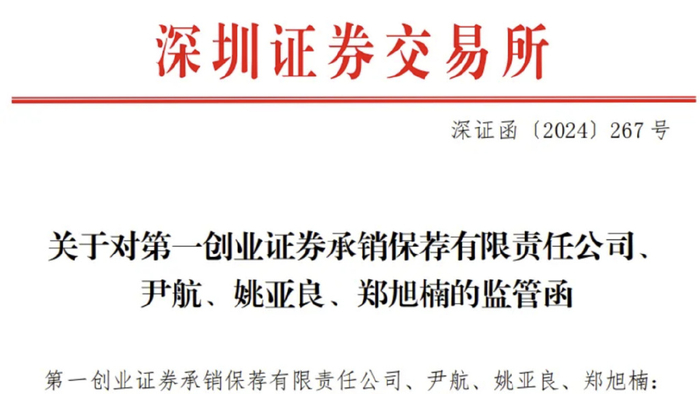 4月11日晚间,深圳证券交易所(以下简称“深交所”)公开发布第一创业证券承销保荐有限责任公司(以下简称为“第一创业”)、尹航、姚亚良、郑旭楠以及新锦动力集团股份有限公司(原恒泰艾普,股票代码300157,以下简称“新锦动力”)及其实际控制人李丽萍在特定对象发行股票过程中存在的违规行为,均给予书面警示的监管措施。