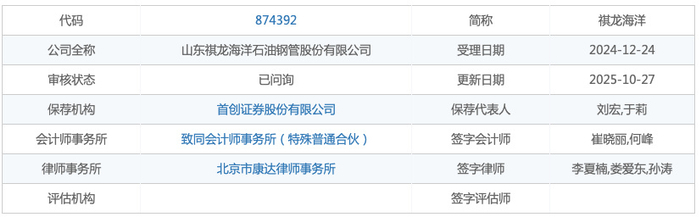山东祺龙海洋石油钢管股份有限公司(简称“祺龙海洋”)主要从事海洋钻井隔水导管的研发、生产和销售,此外,祺龙海洋主营业务还包括油气长输管线的生产和销售及水下油气装备试验技术服务。