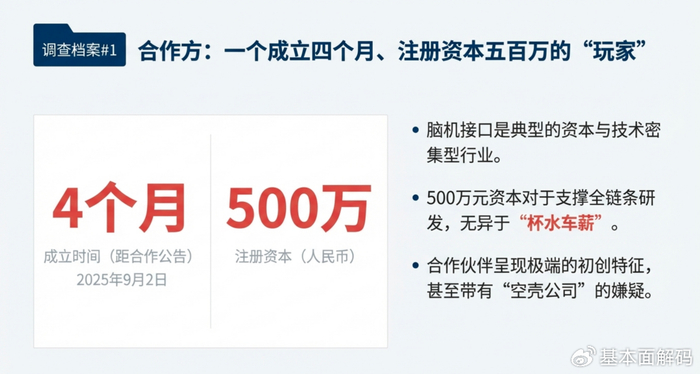 公告显示,脑机星链成立于2025年9月2日。这意味着截至协议签署日(2026年1月6日),该公司仅存续了约4个月。更为关键的是,其注册资本仅为500万元人民币。
