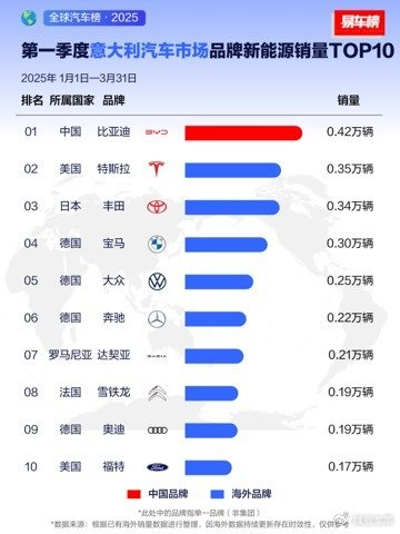 - 意大利:自2023年6月进入市场以来,比亚迪迅速在米兰、都灵等核心城市铺设销售网络。2025年一季度以0.42万辆销量拿下新能源冠军,在售车型包括元PLUS、汉、海豚等。4月,旗下高端品牌腾势在米兰设计周期间官宣进军欧洲,剑指高端市场。