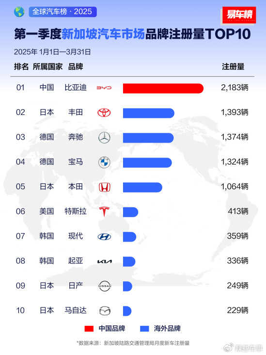 中国新能源汽车龙头企业比亚迪在2025年第一季度延续强劲增长势头,在全球多个重点市场斩获销量冠军,进一步巩固其全球新能源汽车领导地位。从中国香港、新加坡到巴西、意大利,比亚迪凭借技术创新与全产业链布局,推动全球绿色出行转型迈入新阶段。全球销量持续领跑,出口增速一骑绝尘 2024年,比亚迪以427万辆的全球新能源汽车销量蝉联世界第一,出口量达43.3万辆,同比增长71.8%,增速居中国汽车品牌之首。2025年一季度,比亚迪再创纪录:全球新能源汽车出口量达21.4万辆,同比激增117.27%,远超中国新能源汽车出口整体增速(43.87%)。这一成绩的背后,是比亚迪覆盖研发、生产、销售的全产业链投入,以及纯电、插混车型的全场景产品矩阵支撑。亚太市场全面突破,打破传统格局 - 中国香港:据易车数据统计,比亚迪及旗下高端品牌腾势在2025年一季度以0.25万辆销量超越丰田、特斯拉,首次登顶全品牌销量榜首,双品牌合计市占率超30%,相当于每3辆新车中就有1辆来自比亚迪。