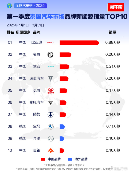 - 泰国:作为东南亚核心市场,比亚迪一季度以0.88万辆销量夺得新能源销冠。2024年7月竣工的罗勇工厂为当地创造了大量就业,同时比亚迪在2025年泰国国际车展中以“比亚迪+腾势”超1万辆订单量,历史性超越丰田(0.98万辆),打破日系车企长达数十年的垄断。
