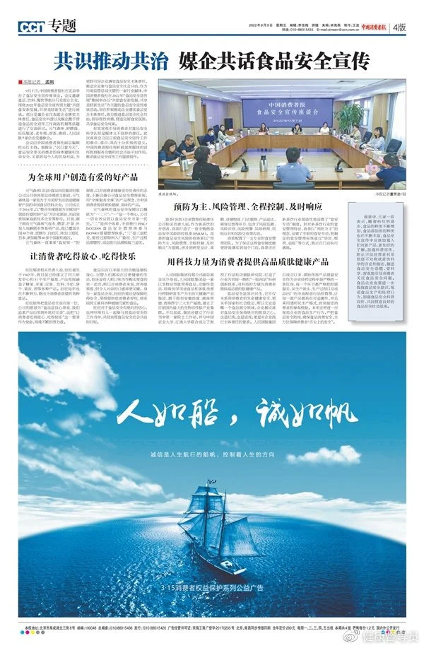 9月7日,恰逢2022全国食品安全宣传周期间,中国消费者报社在京召开以“共创食安新发展,共享美好新生活”为主题的食品安全宣传座谈会。作为食品行业的代表性企业,人民国肽集团副总裁金凤女士受李建琪总裁委派出席活动,与元气森林、钟薛高、旺旺集团、老乡鸡、喜茶、雅培等众多知名企业一道,现场展开座谈交流,共话食品安全新发展。