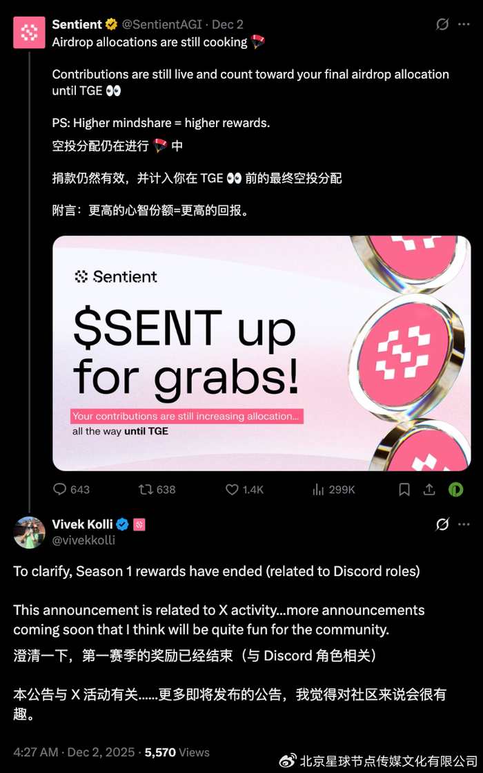 此前,Sentient 官方曾于 11 月 17 日官宣第一季活动正式结束,彼时,代币空投主要面向 Sentient 社区成员(含 Discord 社区成员)、AI 聊天用户、加密 KOL、开源研究人员等人,11 月 18 日,其正式开放,原计划截止时间为 11 月 29 日,随后,官方又。官方空投注册链接延迟注册截止日期至 12 月 5 日