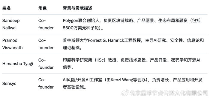 在 Sentient 颇为傲人的种子轮融资中,“投资就是投人”这一黄金法则体现的淋漓尽致,而 Sentient 项目背后的团队成员,确实堪称“创业天团”(整理自 Grok)——