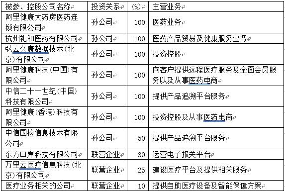 2015年:公司的主营业务为中国药品电子监管网,并开始全面进军互联网医药健康领域,宣布将以194.48亿港元反向收购阿里巴巴旗下的在线大药房交易平台,建立O2O药房平台,以期打通线上和线下药房。