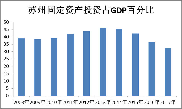 相比之下,苏州就没有那么依赖固定资产投资,其固定资产投资占GDP百分比最近十年都在32%-47%之间,去年降到了32.5%,苏州的产业较为高端丰富,不需要太多固定资产投资拉动。
