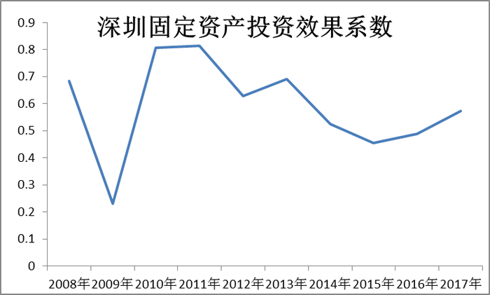 相比之下,深圳的固定资产投资效果系数较高,最近三年稳步上升,去年达到了0.57,这意味着投资固定资产一块钱,去年能拉动0.57元GDP,在深圳的效果远高于北京、上海和广州。