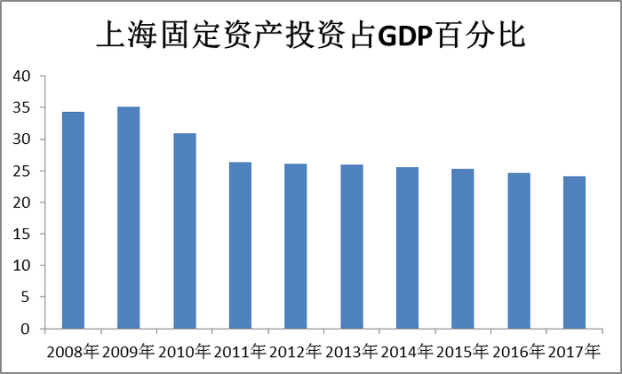 上海和北京类似,不过近些年来固定资产投资占GDP比重最近几年稳步下降,一直降到了24%左右,上海第三产业成长很快,对固定资产投资依赖越来越轻。