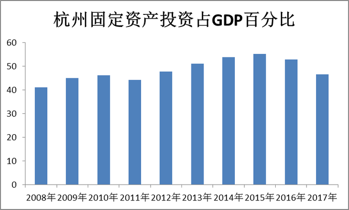 杭州的固定资产投资占GDP比重没有武汉、重庆、成都、天津那么夸张,但还是比苏州要高,占到了41-56%。
