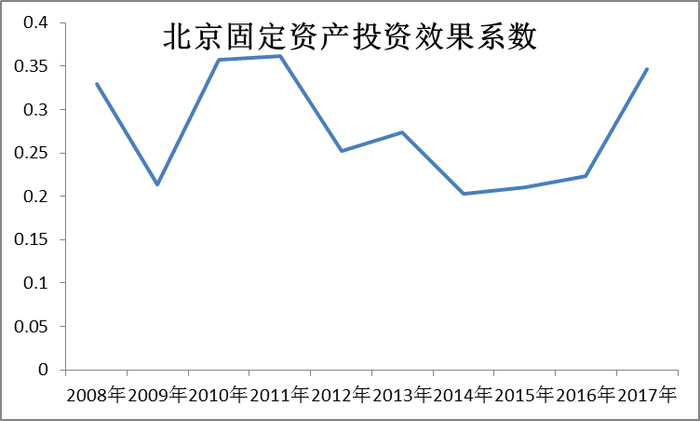 北京近十年里的固定资产投资效果系数较为稳定,在0.2-0.37之间波动,在去年重新升到了0.35,这意味着投资固定资产一块钱,去年能拉动0.35元GDP。