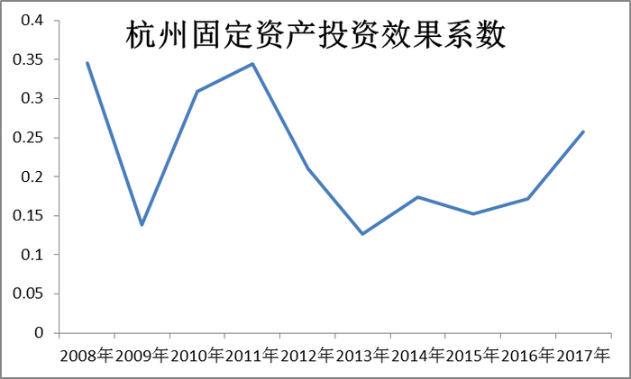 杭州近十年固定资产投资效果系数一直在0.12-0.35之间,最近三年稳步回升,达到了0.26 ,但和北上广深还是有一定差距。