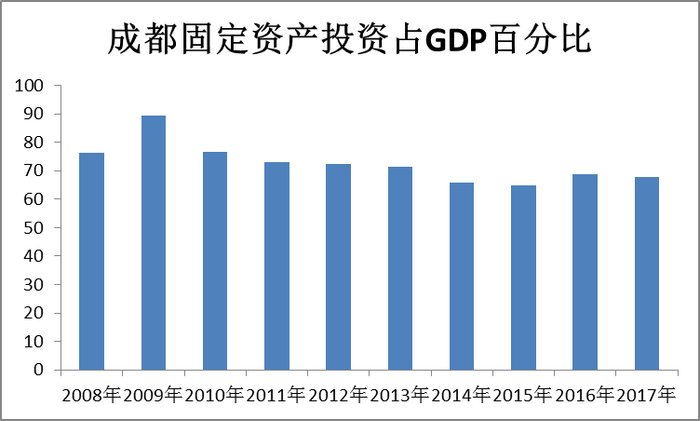 和天津、重庆类似的,还有成都和武汉。武汉近十年固定资产投资占GDP比重高达56%-71%,成都则是达到了64-90%。