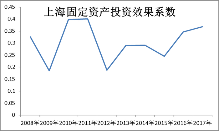 趋势与北京相似的还有上海,虽然波动幅度比北京要大一些,这十年上海固定资产投资效果系数在0.18-0.41之间波动,在去年重新升到了0.37,这意味着投资固定资产一块钱,去年能拉动0.37元GDP。