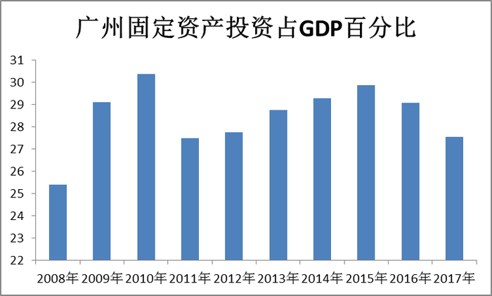 广州最近10年固定资产投资占GDP的百分比一直在25%-31%之间。