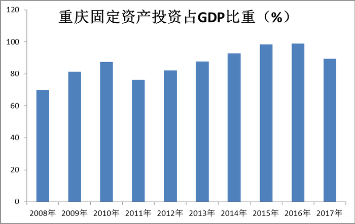 之前分析过的天津和重庆,其固定资产投资占GDP比重一度高达80%以上,最近十年这两座城市,天津固定资产投资占GDP比重高达50-82%,重庆则是69%-99%,重庆对固定资产投资的依赖程度还要高于天津。