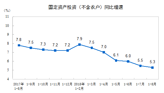 我们就看看投资吧。2018年1-8月份,全国固定资产投资(不含农户)415158亿元,同比增长5.3%,增速比1-7月份回落0.2个百分点,回落幅度比1-7月份的0.5个百分点收窄。可以说增长越来越慢,而且还要考虑投资的效率问题——你投下去钱,究竟拉动GDP的效果如何?如果一味抓投资而引发放水,之前去杠杆的努力是不是白费了?