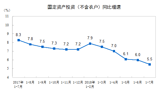 再看固定资产投资,2018年1-7月份,全国固定资产投资(不含农户)355798亿元,同比增长5.5%,增速比1-6月份回落0.5个百分点。从环比速度看,7月份固定资产投资(不含农户)增长0.43%。其中,民间固定资产投资222649亿元,同比增长8.8%。固定资产投资增速也在趋缓。
