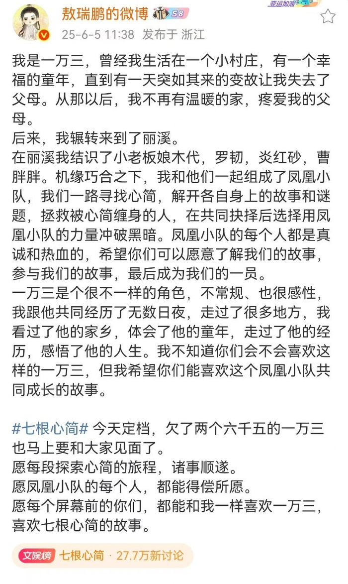 #敖瑞鹏[超话]##敖瑞鹏发博谈一万三##敖瑞鹏说一万三很不一样# 敖瑞鹏发文谈一万三,说一万三是一个很不一样的角色希望大家喜欢一万三。期待6.8《七根心简》播出!