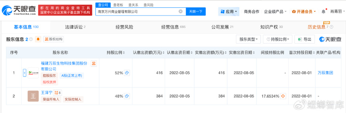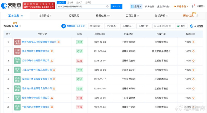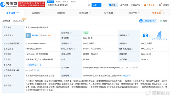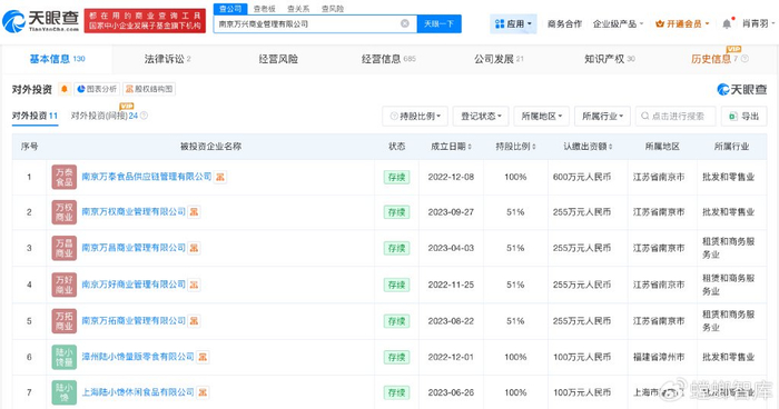 天眼查App显示,好想来关联公司南京万兴商业管理有限公司成立于2022年8月,法定代表人为林该春,注册资本800万人民币,经营范围包括食品销售、企业管理咨询、食用农产品批发、食用农产品零售等,由万辰生物(300972)、王泽宁共同持股。对外投资信息显示,该公司持股11家公司,其中10家为存续状态。通过直接或间接持股,该公司拥有50余家企业的实际控制权。