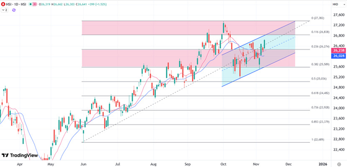 恒指经过上周的周度收高后打破了此前的下行通道,当前尝试扩大上行通道,关键的突破位在27000关口,更高阻力在10月初高位的27380,在科技巨头业绩公布前可能限制其突破重要关口的动能,所以关注会否在一个月高位盘整,守住通道内均线的支撑为关键,尤其是20日均线所在的26000关口。
