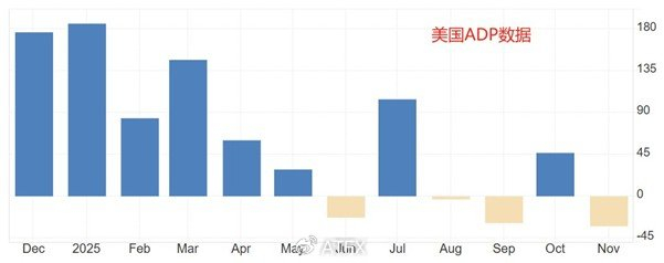 本周三21:15,美国自动数据处理公司将公布美国12月ADP就业数据,该数据被业界称为小非农,对周五大非农数据表现有前瞻作用。前值为-3.2万人,预期值4.5万人,预期值较为乐观。今年6月份以来,美国的ADP数据表现正值与负值交替出现的特征,由于11月份的公布值为负值,所以12月份的预期值4.5万人达成的概率较高。长期来看,美国的就业市场依旧疲软且不稳定,单月数据表现强劲不能有效扭转市场的悲观预期,12月ADP数据对美元指数提振作用有限。