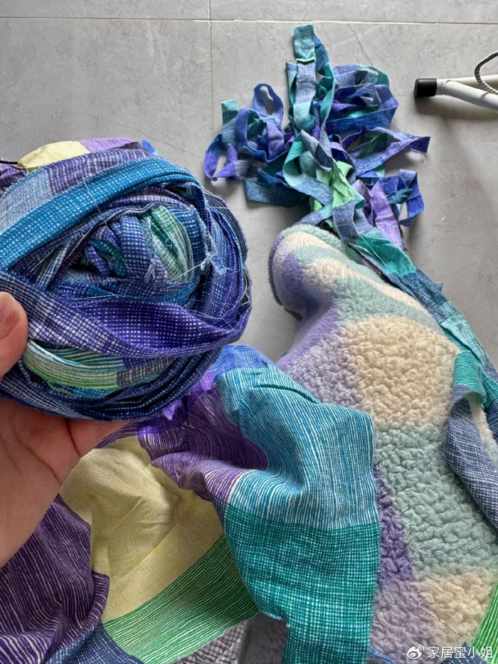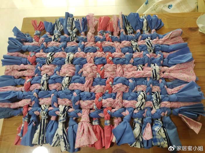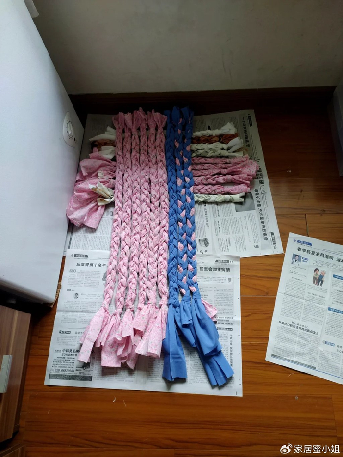 老妈也有很多不舍得,想着做点啥能二次利用起来!我是先把旧床单撕成细条,3骨编成辫子,最后把辫子竖起来缝起来就行了。