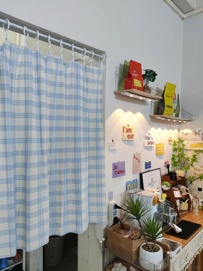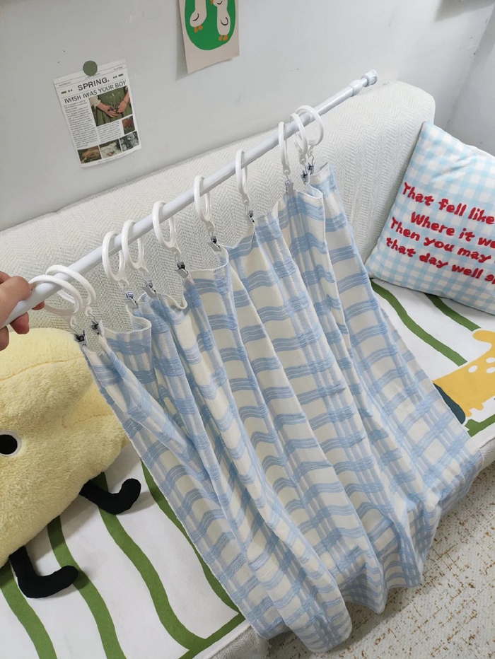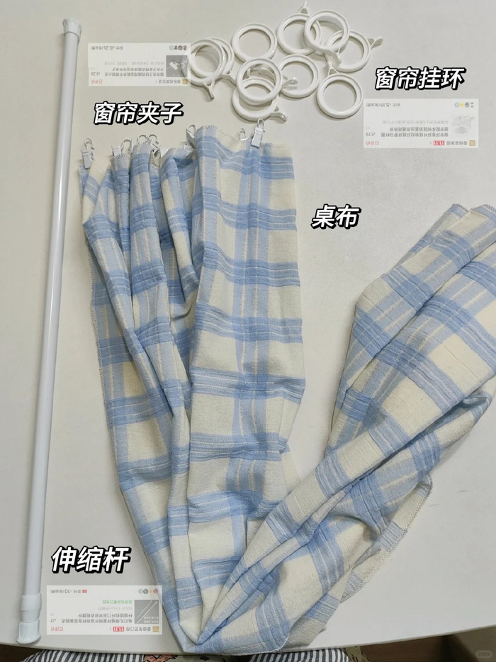 再用窗帘夹把床单夹住,挂在挂环上,再将挂环穿过伸缩杆。接下来就是让伸缩杆上墙了,隔断完成,拉起来非常顺滑,效果也很NICE!