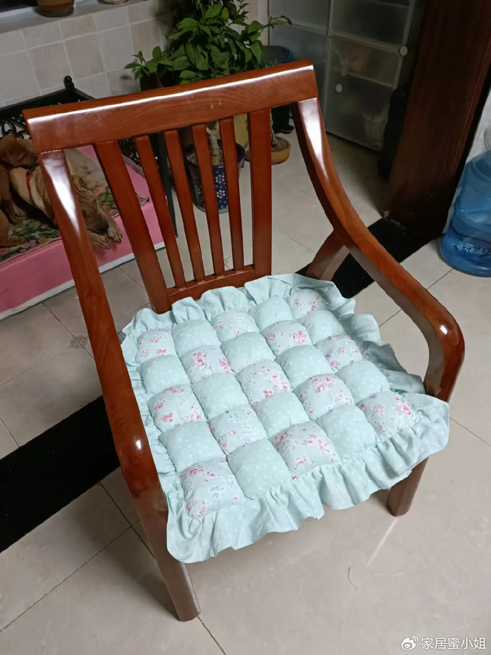 制作方法也很简单,直接把不用的旧床单叠成四方块,然后裁剪下来,把每个边儿用针线缝一下,不就能得到一个简单的椅垫了吗?