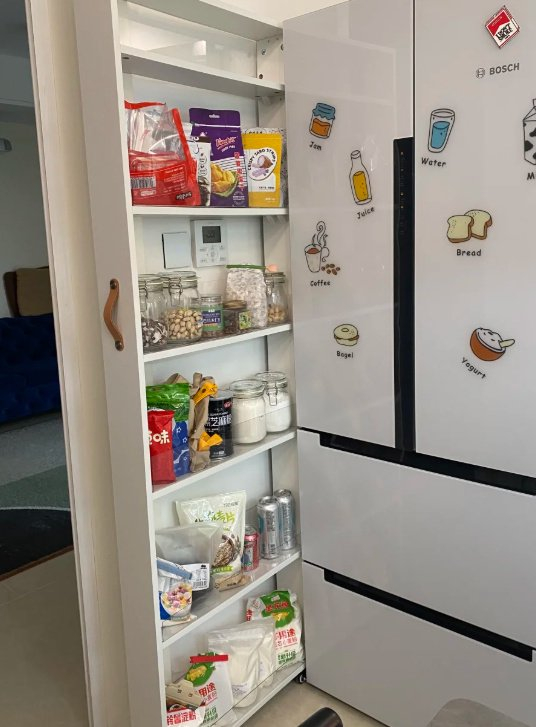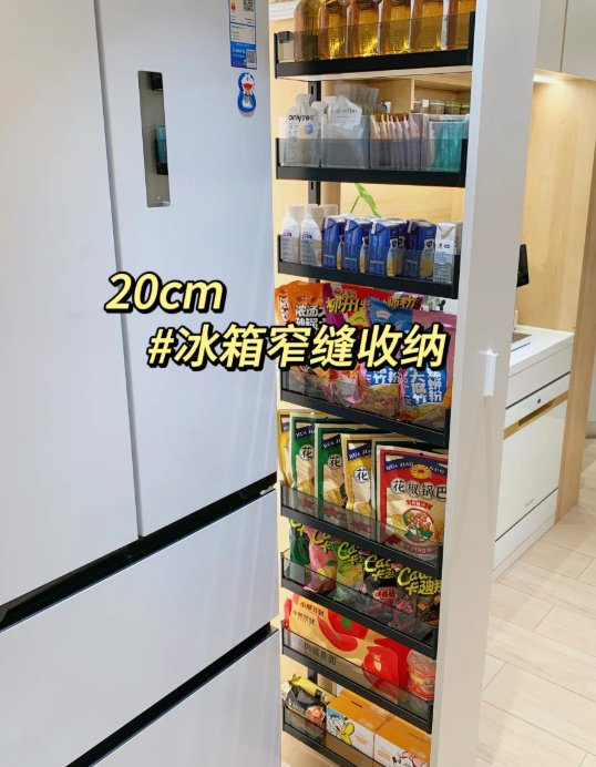 只要是我们家里面有缝隙的地方,我们都可以采用这样设计方式,比如,冰箱跟橱柜或者墙壁有一个缝隙,就可以在里面装上抽拉收纳柜,在这里放上厨房物品,或者当做零食柜都可以。