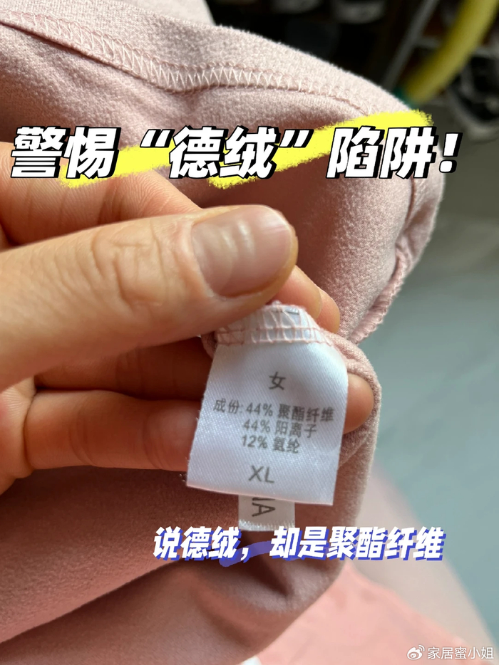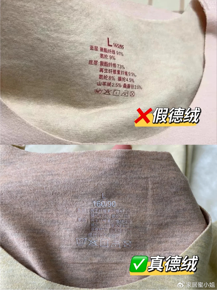 再混入一些山羊绒或者桑蚕丝,氨纶等一些面料穿在身上舒适性也比较好,而且摸上去软乎乎的,保暖性也很不错,但是假的德绒是以聚酯纤维为主的,甚至有的已经达到100%聚酯纤维,这种假德绒千万不要买,因为看上去比较柔软,但是穿在身上却一言难尽。