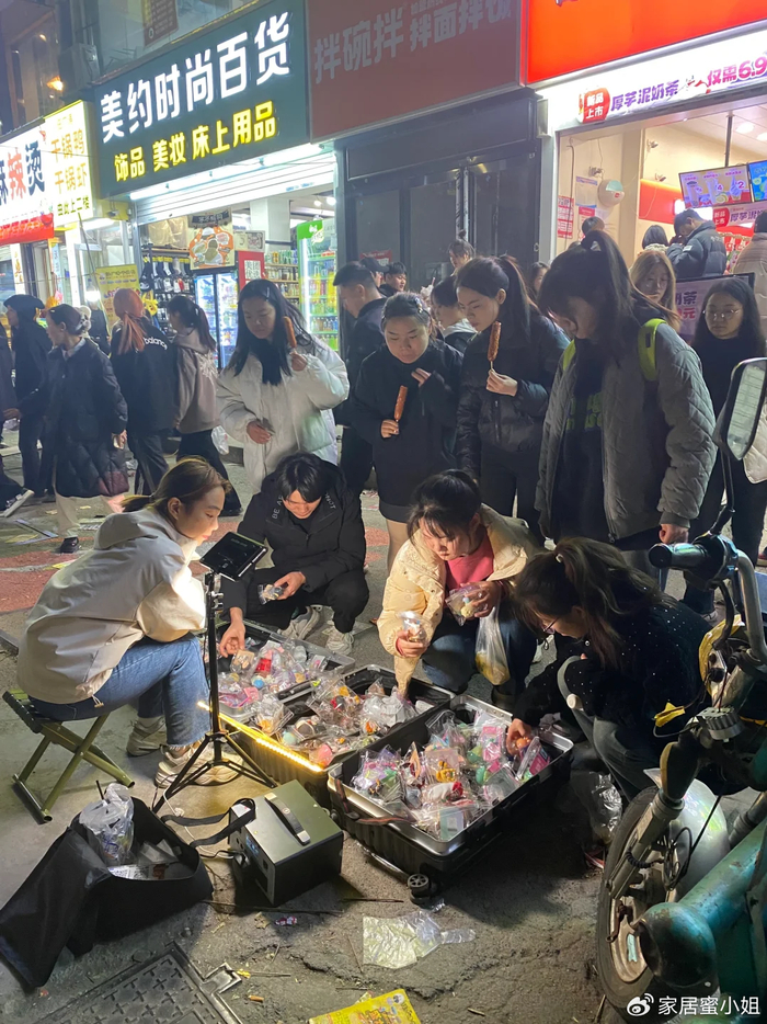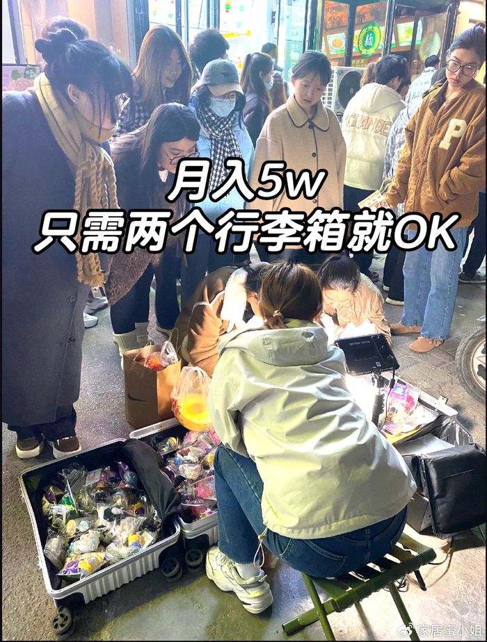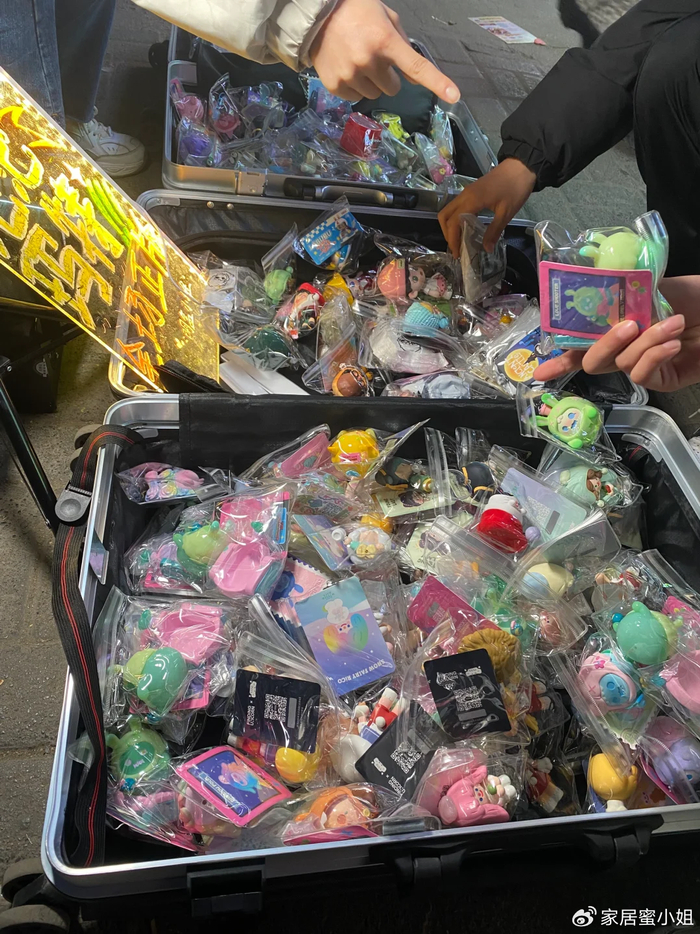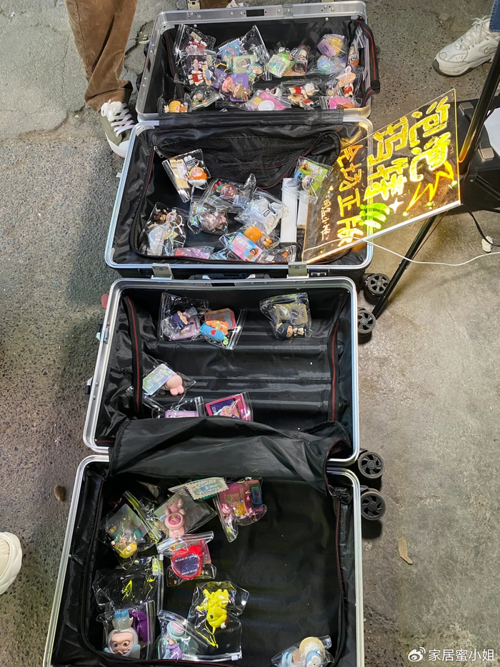 比如最近很火的盲盒,他们直接把盲盒扔在行李箱里,感兴趣的顾客就直接蹲在地上挑选。