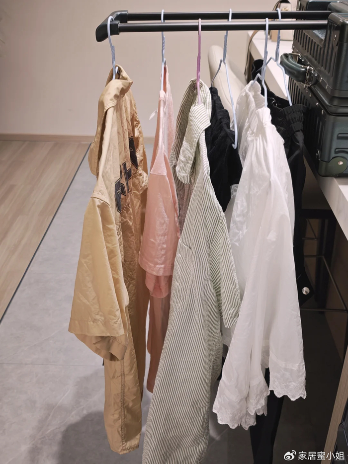 这个时候,我们可以将闲置的行李箱放在高处,然后拉出他的拉杆,这不正好就有了一个挂衣杆了吗?