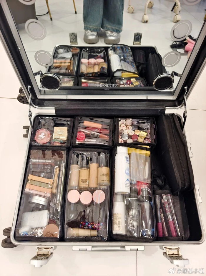 方法也不难,把原来行李箱三层内盒撤掉,然后再买几个化妆包,重新归置一下里所有的化妆品。