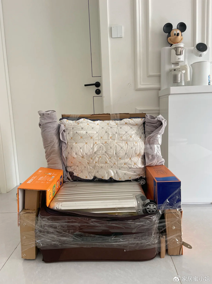 如果你家有闲置的行李箱,可以用它改造成一个简易的小沙发。毕竟行李箱放着也是放着,不如让它成为有用的东西。