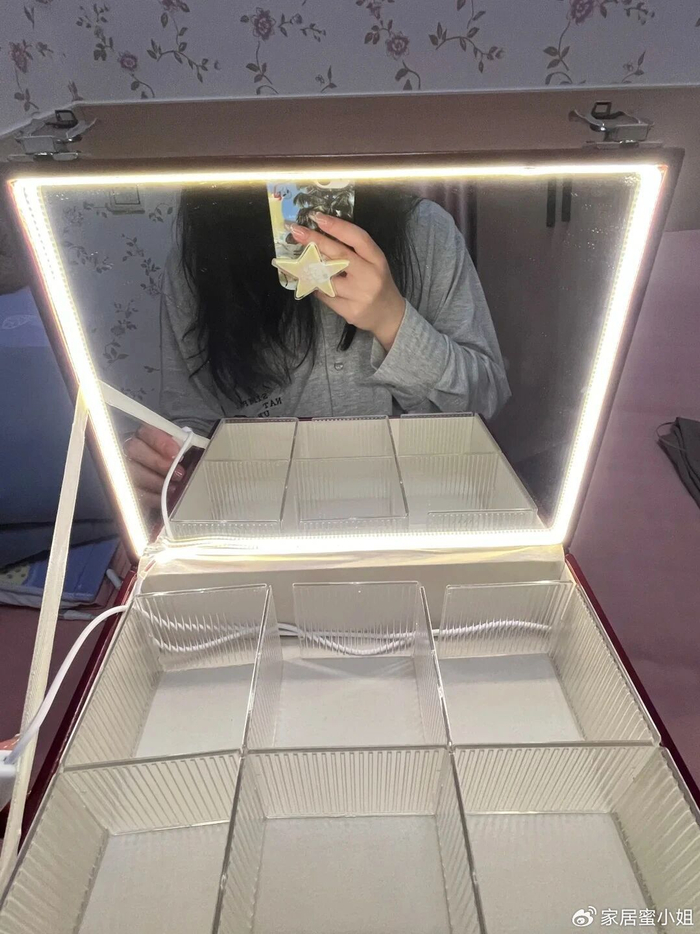 另外还可以在镜子背面贴上3m双面胶,然后把它贴在行李箱盖上,再用线性的灯带沿着镜子四周贴上,你就得到了一个还自带化妆镜的化妆箱。