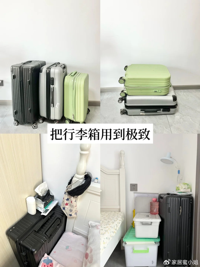 就得到了一个平整的桌面,还可以放水杯,充电器等。如果是用行李箱来当床头柜,你还可以随意摆放,行李箱比较多的情况下,甚至可以把它们叠放在一起。