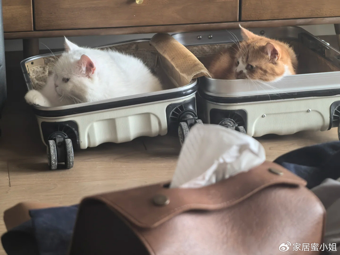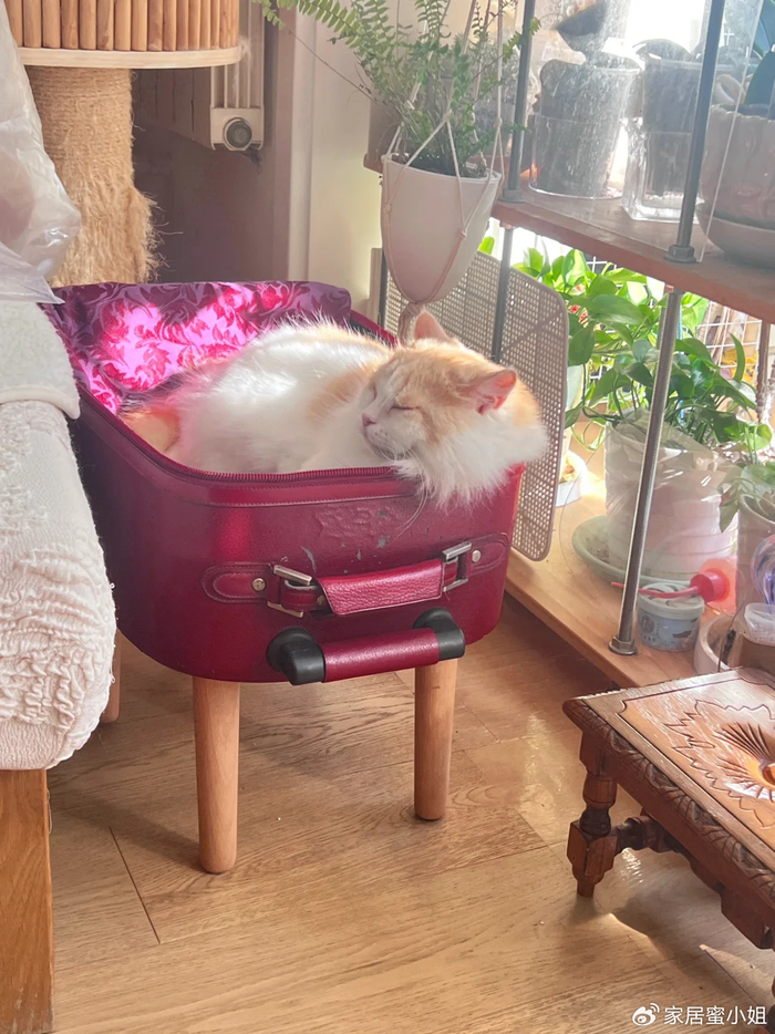 如果家里养了一只猫咪的话,直接打开行李箱,然后铺上一些柔软的垫子,让猫猫躺进去又舒服又暖和。